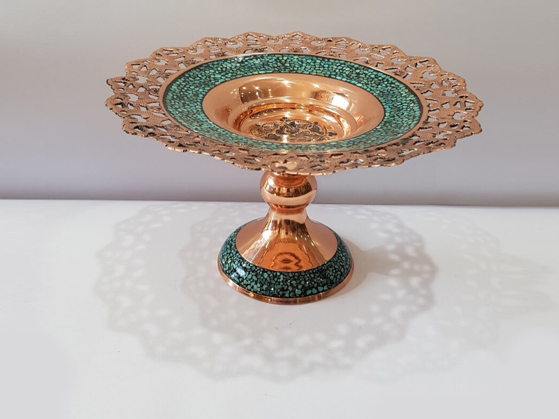 شیرینی خوری فیروزه کوب با ارتفاع 30 سانتی متر از بدنه مسی و فیروزه های تزئینی زیبا ساخته شده است. این محصول که از ارزنده ترین صنایع دستی محسوب می شود، به دست هنرمندان بزرگ این مرز و بوم ایجاد شده است. آنچه این شیرینی خوریمس و فیروزه را مهم نشان داده است، ظرافت بالا در طراحی است.